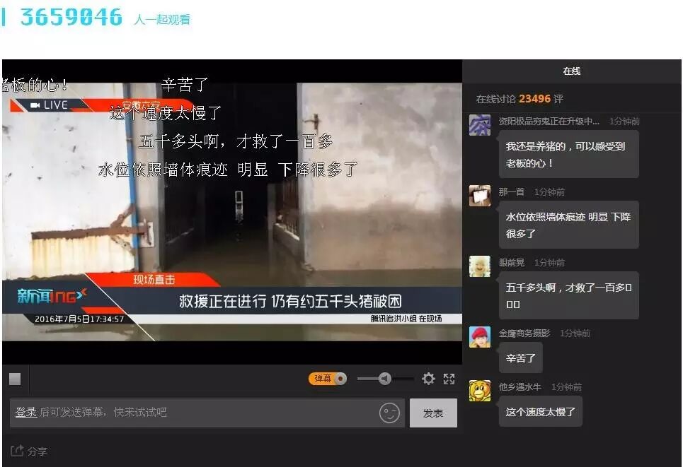 “目前已经有300万人在线观看直播,第一次感受到直播的强大,这两年直播已经很火,这次从腾讯直播6000头生猪救援看到了国人爱看热闹的巨大潜力。也很感谢有人去救了这些猪和猪的主人。”