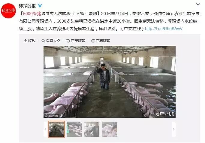 原来,昨天(7月4日)有一条新闻报道在安徽六安舒城县某公司养殖场内,6000多头生猪浸泡在洪水中近20小时,生猪无法转移,由于大雨持续,6000余头生猪已无生存希望,养殖场员工不得不与自己精心饲养的生猪挥泪诀别。