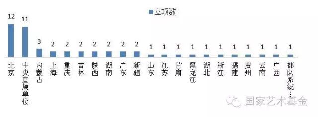 从省(区、市)和系统分布来看,在51个立项资助的具有科技、创新和跨界融合特点资助项目中,北京12项 ,居于首位。,居于第二位。内蒙古3项,上海、重庆、吉林、陕西、湖南、广东、新疆各2项,黑龙江、山东、江苏、甘肃、湖北、浙江、福建、贵州、云南、广西和部队系统(含武警)各1项(详见图四),基本反映了各省区艺术科技应用和发展水平。