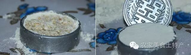第三步:在模具里面铺上一层和好的面粉,周围也铺一层,然后中间方式放入之前做好的花生、芝麻等馅料。然后在上面撒一层饼粉覆盖饼馅。