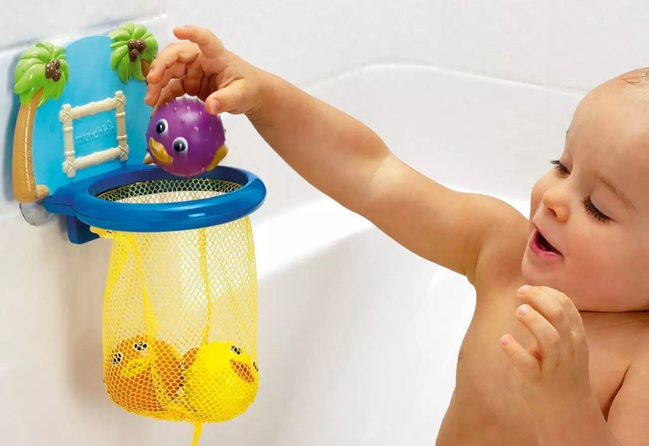 篮板紧紧地吸在澡盆壁上,然后把3个圆形小鱼当做喷射玩具,射中篮筐即可得分。