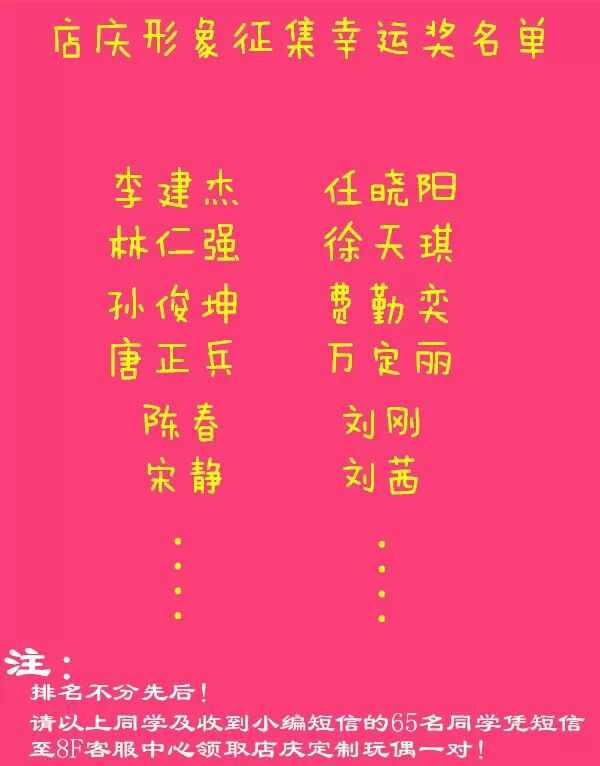 首页 | 美妆知识 | 『65周年店庆真来啦! 』65周年庆卡通玩偶获奖名单公布啦! 『65周年店庆真来啦! 』65周年庆卡通玩偶获奖名单公布啦! 2023-04-19 23:50:29 !获得幸运奖的65位童鞋久等啦!现公布名单:我们都在奔赴百大,你嘞?65周年店庆嗨翻全城,快乐不打烊!哎哟,不错哦!~