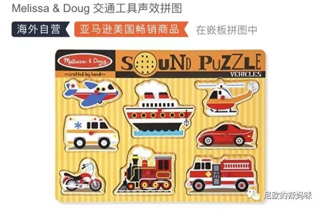 MELissa&doug,这个是也是美国亚马逊上热销的牌子,海外购价格不算贵,认识交通工具及其他们发出的不同声音,又是简单的拼图,没有拼图类玩具的,可以考虑入手一个。还很很多其他的系列,这个牌子可以在亚马逊上搜一下。等尼欧大一点准备入手门闩套件,男孩子就爱这个,图在后面我的愿望清单里。