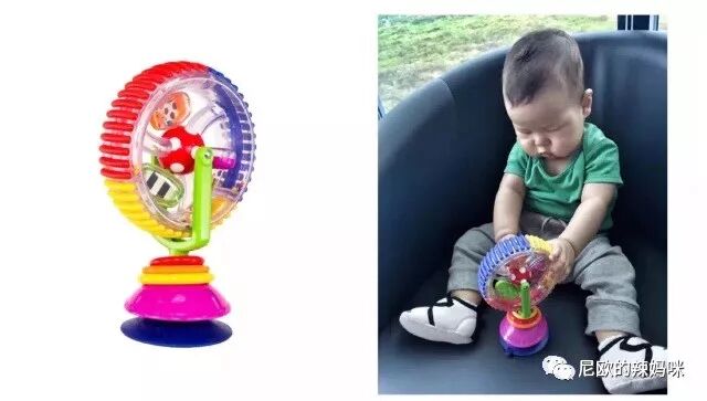 这是麻麻在美亚上一眼看中的玩具,难以取舍,于是买了两个样式的。底部附有吸盘,可以放在餐椅和地板上,材质安全,不含BPA,转动起来里面的彩珠会发出沙沙声,强烈推荐