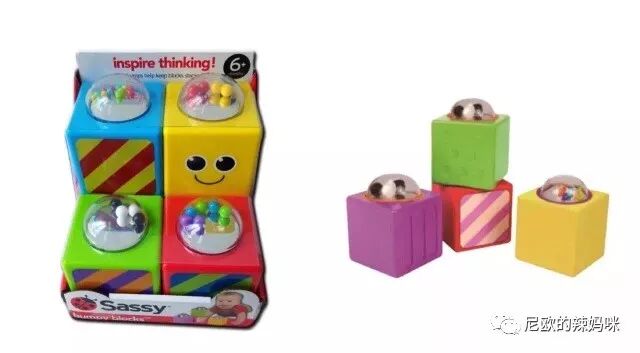 买的这个SASSY的积木,属于中规中矩的吧。没有特别爱,也没有不爱。积木本身也属于开放性的玩具,没有固定的玩法,给NEO自己去摸索。色彩鲜艳,材质安全,方块的四角都是圆角,不用担心伤到。摇晃中会发出不同的声音,每一块的3面设计了不同的纹路和凸点。也是一款锻炼触觉和手眼协调的玩具。