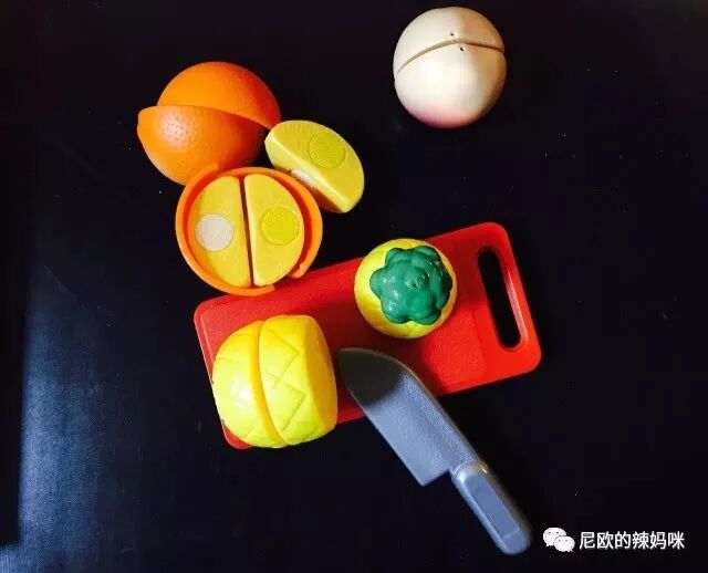 结合卡片,实物,能让宝宝将这些产生联系。这是我最初购买的目的。对于不满一岁的宝宝来说,暂时用不了“刀”去切,玩具大多都是使用魔术贴或者磁铁,用两手掰开,也可以玩的不亦乐乎,再试着将它们粘在一起,看似简单的动作,锻炼了手眼协调能力;大概从10个月可以玩到2岁,是从徒手掰开玩具,到模仿大人有模有样的切水果,再到钟爱角色扮演的年龄段。