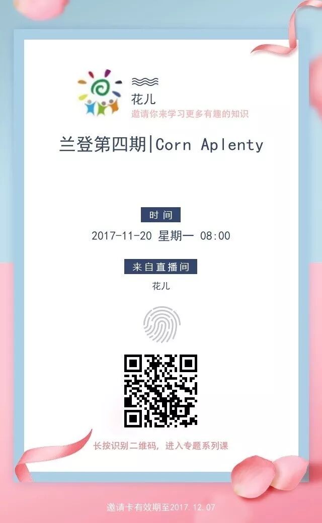 本周是兰登英语第四期的第一周。本周我们一起学习的绘本是《Corn Aplenty》。周一的内容,我们会采用两种方式进行分享,大家可以通过邀请卡进入到荔枝微课直播间进行收听,还可以通过花儿的微信公众号进行查看。