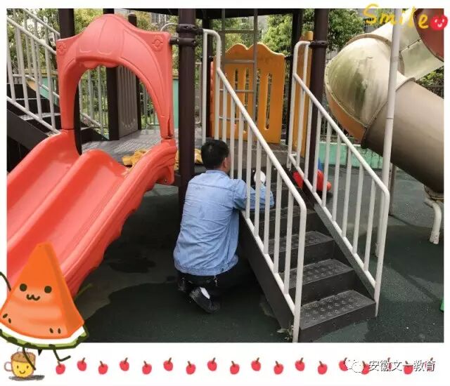 这次安全大检查不仅保障了幼儿在游戏中的人身安全,同时延长了玩具的使用寿命;随后教师们配好消毒物品,对户外的大型玩具滑梯进行一次全面的清洗和消毒工作,防止各种疾病的传播和蔓延。