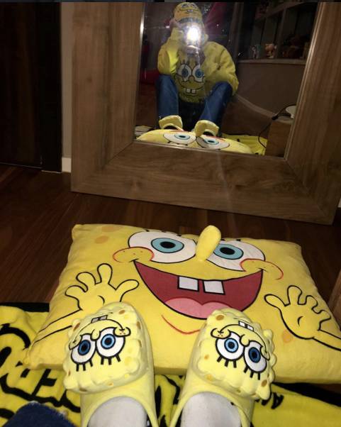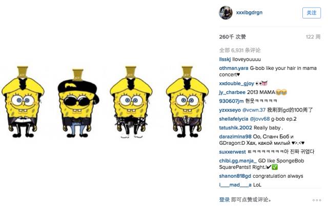 GD穿的海绵宝宝卫衣和拖鞋,都是AAPE × SPONGEBOB的出品,卫衣价钱大约在300多,拖鞋200以内。