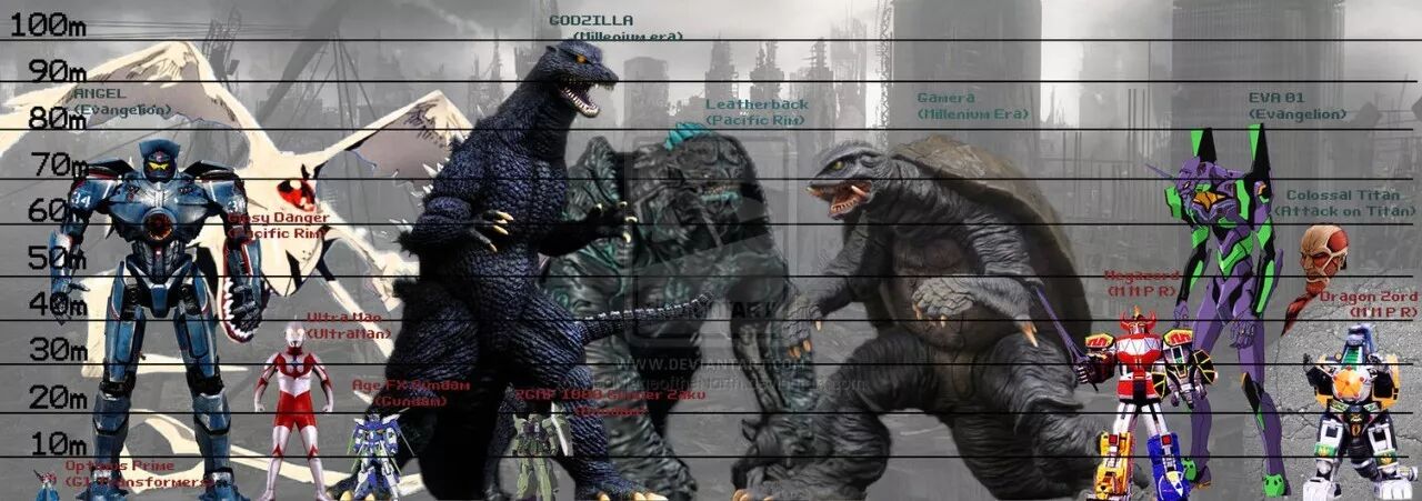 有外国网友十分认真,将不同怪兽大小比例放到一起做对比,原来高达是这么细小,哥斯拉是这么巨型!