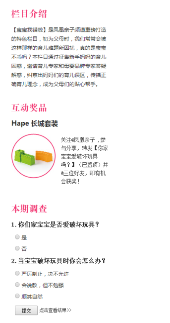 首页 | 美妆知识 | 凤凰亲子·宝贝,对不起: Hape邀爸比、妈咪们一起讨论“玩具坏了是故意破坏?” 凤凰亲子·宝贝,对不起: Hape邀爸比、妈咪们一起讨论“玩具坏了是故意破坏?” 2023-04-19 23:50:29 “刚刚买回家的玩具,前一分钟还爱不释手,后一分钟就被拆得七零八落,很多家长都会对宝宝的“破坏”行为头痛不已。宝宝为什么喜欢“破”坏玩具?当他们这样做时,家长是否需要干预?“凤凰亲子专题栏目“宝贝,对不起”本期将与各位爸比、妈咪一起探讨玩具的破坏问题!快点击右下角“阅读原文”直通凤凰亲子参与互动讨论【你家宝宝爱破坏玩具吗?】,即有机会获得由Hape倾情提供的明星沙滩玩具“万里长城”沙模套装!Hape沙滩玩具,采用安全食品级材质,无任何气味,可以放心和宝宝一起玩耍!质地坚韧,耐晒耐高温,是一款可沿用多年的高品质玩具!更有育儿专家赵春梅女士为你解析宝贝们这些“小动作”的真正含义哦,快来点击参与吧!