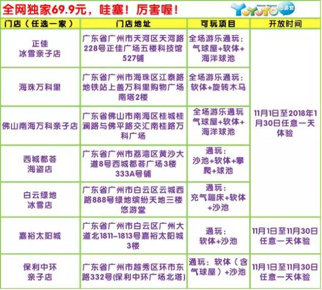 双11提前抢 | 亲子乐园悠游堂广佛7店任选其1