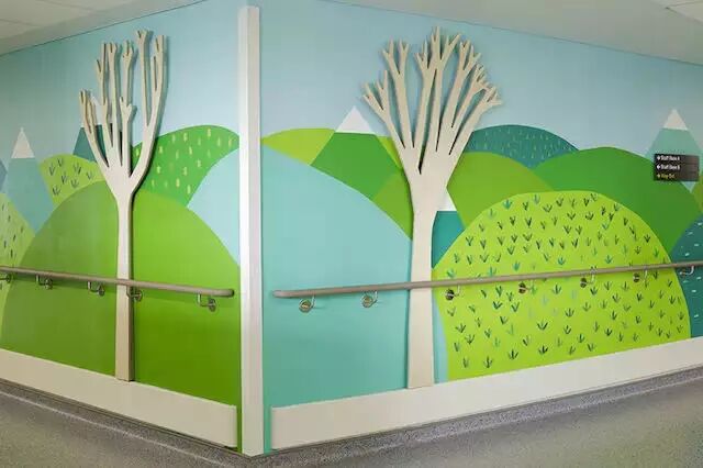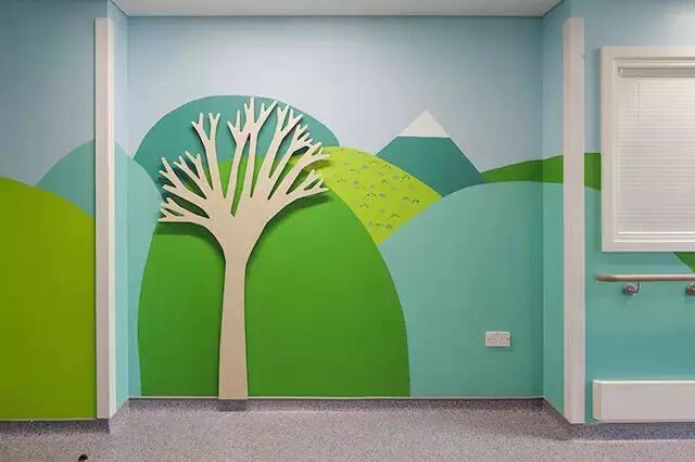 DonnaWilson 最出名的作品是她设计的各种靠垫等家纺用品。但这一次她选择带来病房的却是一幅明亮的农村景致。温暖的蓝色与绿色衬托着雪山顶部的点点白色,而木质纹理的三维树木亦是紧贴着墙壁。
