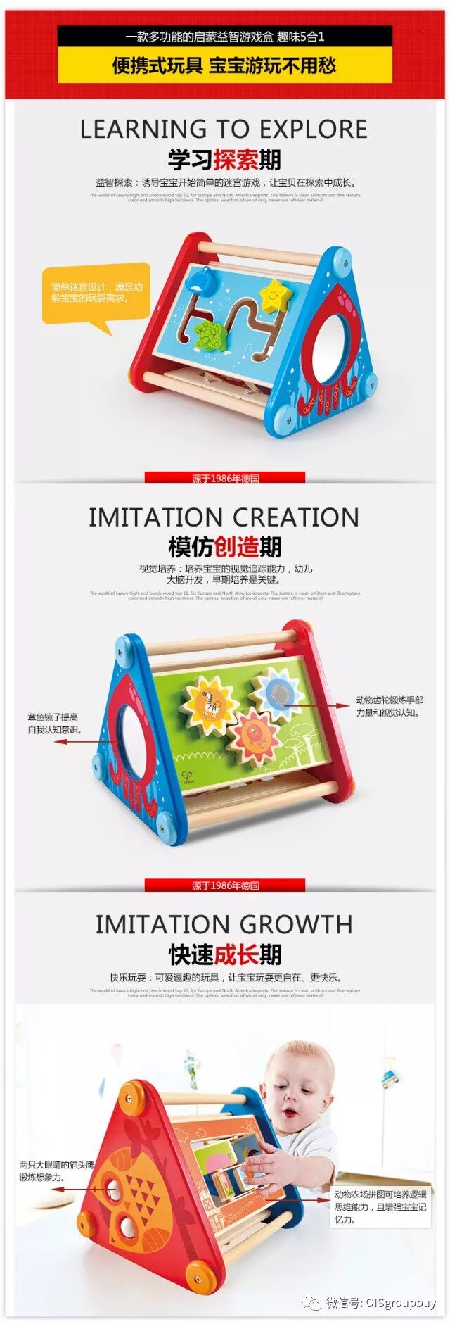 近三十年来,Hape 玩具一直坚持原创,集团汇集了一批来自世界各地的优秀设计师,使用天然高品质的环保材料和德国的制造工艺及标准,使得Hape 的每一款玩具都得以成为童年生活中绵长的陪伴。