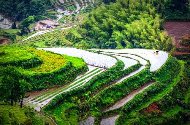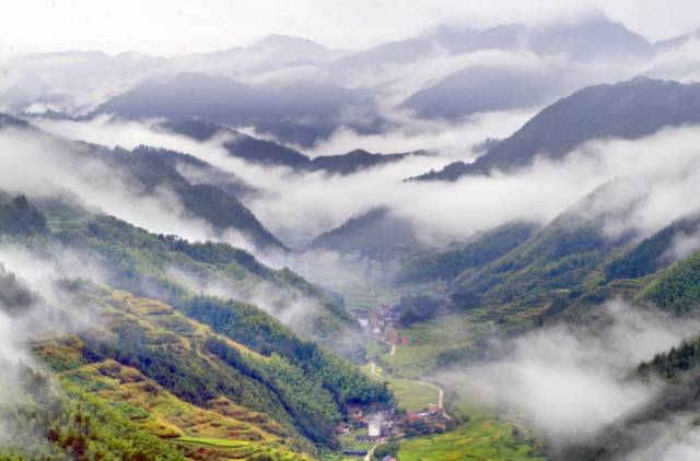 这里海拔跨度为200米-1400多米,垂直高度1200多米,跨越高山、丘陵、谷地三个地质景观带。因为海拔高,田里的水蒸发后受气流影响形成云海,从山顶上望过去,云雾就像河流一样在山间流淌,村庄、梯田与树木点缀在云海之间,虚虚实实,场面相当梦幻。