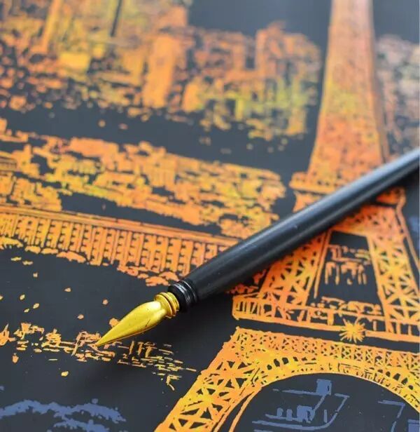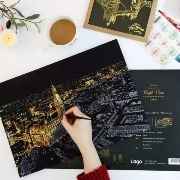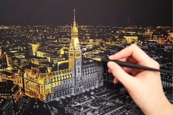 在instagram上爆红的城市夜景刮画,没有涂《秘密花园》那么麻烦,画法非常简单,只要用刮笔沿着灰色的部分刮就行了,完成后就会构成一幅城市夜景图,手残党的减压利器。