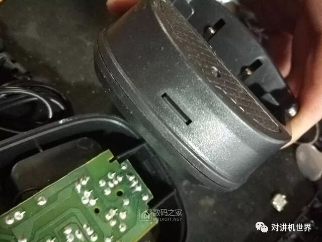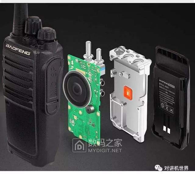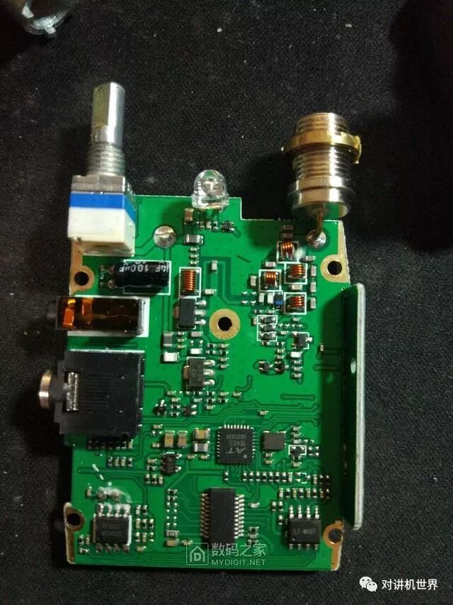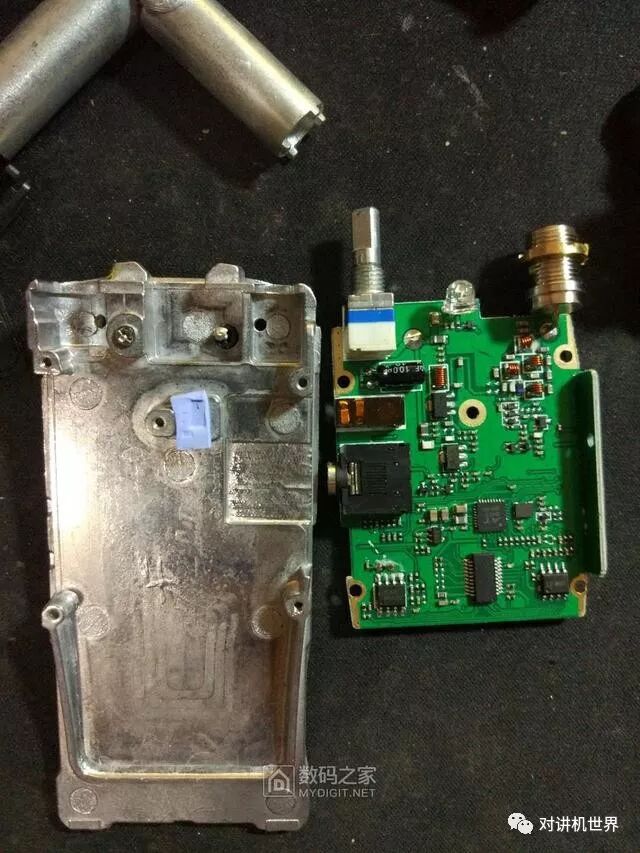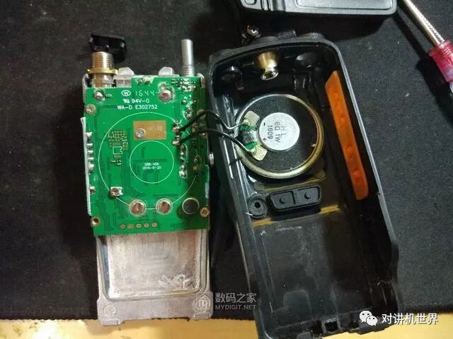 这是刚拆开的样子。拆的时候卸下背夹,拿下背夹螺丝处盖板,然后拔下音量旋钮,拧下音量旋钮内的螺母,然后拿一字改锥撬对讲机底部铝板附近,注意胆大心细,壳子比较紧,耳机插座那可能会卡住,与前壳分离后不要大力往下拽,以免把喇叭线拽断。