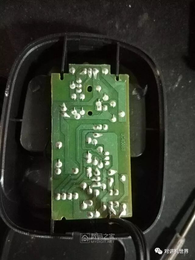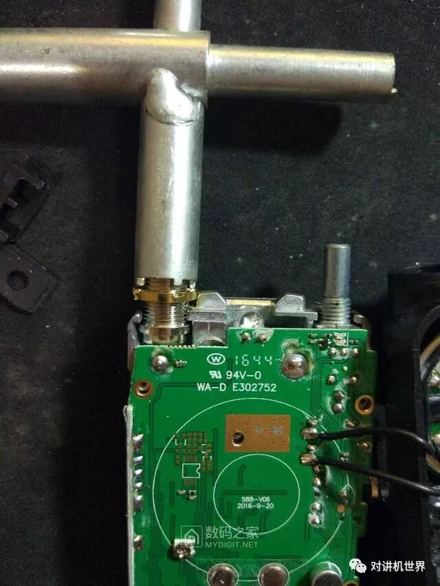 天线座上的螺丝有704胶,直接拧不下来,还是上专用工具好使。拆下四颗小螺丝并拧松天线座螺母后,电烙铁烫开音量旋钮附近的正极大焊点,电路板就可以取下来了。