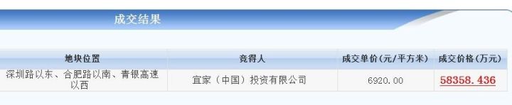 10月13日,崂山区出让深圳路以东、合肥路以南、青银高速以西批发零售用地网拍,当日仅1家企业报名,11号 宜家(中国)投资有限公司加价10元/平方米拿下该地块,成交楼板价6920元/平方米,成交总价5.84亿元,宜家正式落地青岛。