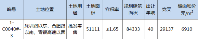 9月22日,崂山区出让深圳路以东、合肥路以南、青银高速以西批发零售用地一宗,占地面积51111.4平方米,容积率1.65,规划建筑面积84333平方米,起始楼板价6910元/平方米,起始总价5.83亿元,竞买保证金2.91亿元(起始总价的50%)。