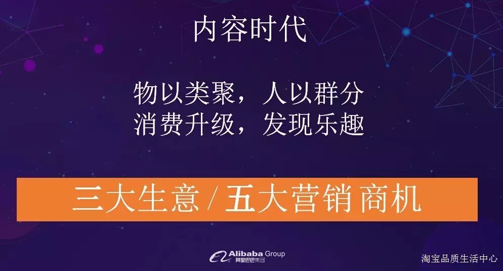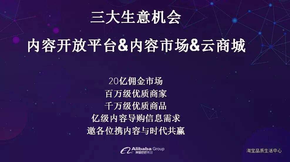 在这个内容时代之下,从淘宝生活品质中心看,有三大生意机会,五大营销机会。非常愿意和在座所有媒体及导购伙伴共享商机,抓住内容时代的风口。