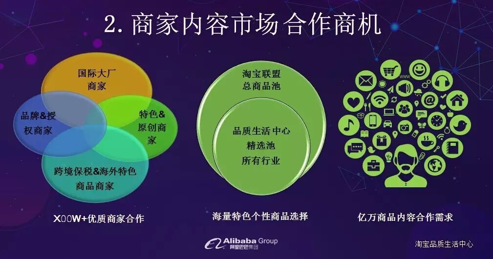 第二个商机是巨大的内容市场面临转型的需求。淘宝有数以百万计的优质商户,海量的优质商品,非常希望和在座各位,专家达人或专业机构对接,在这里酝酿了大量内容市场需求商机。