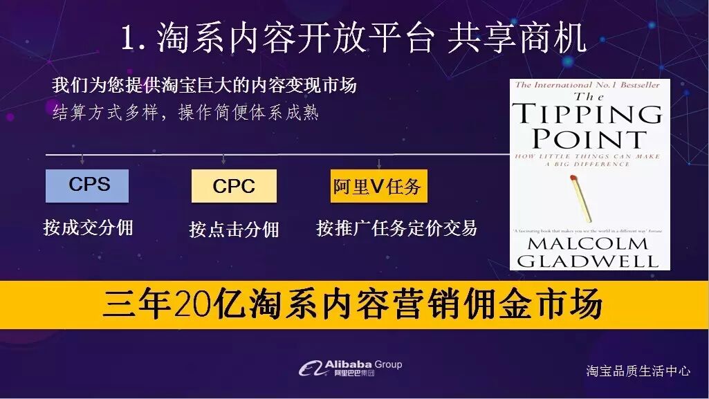 在结算领域,除了CPS、CPC变现的交易模型,我们还会有阿里微任务,让优质商家的需求更高效地触达精准导购市场,让那些有垂直领域专业能力的CP更加高效、更有回报地承接任务,推动交易。淘宝在消费媒体侧的改革和推动,就像引爆点(the tipping point)一样,会加速整个交易模式的转化,内容型电商会加速崛起。淘系此前也明确对外发声,在这个共建过程中,三年时间将有佣金市场,从而加速形成内容营销的风口。请大家第一时间加入进内容时代的营销,加速转型。