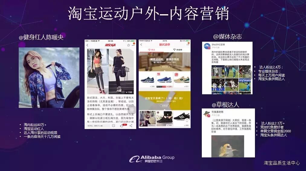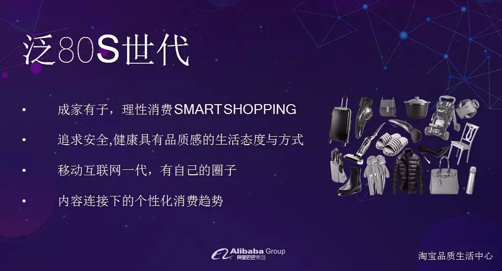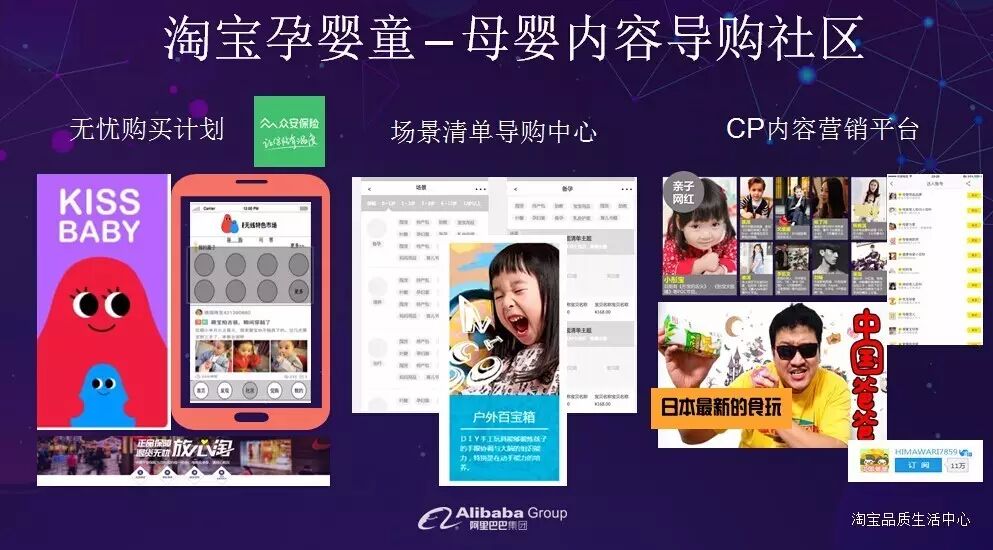 我负责淘宝母婴、运动户外、中国质造,主要关注就是80s时代的人群,他们有一些基本特点。首先,面临成婚、成家、有孩子的状况,消费的时候就会更加理性,而不再是冲动购买。第二,他们更加在意安全品质、生活方式的质量。第三,在移动互联网的时代,他们经常在不同圈子里进行交流与互动,她们喜欢基于真实的口碑和互动来去掌握需要的信息,在母婴、运动、户外都是这样的,天然聚粉也天然聚圈。移动互联网带给了人随时随地的聚集交流互动的时机,也进一步推动人成为入口的形成。最后是消费的个性化趋势,这里主要是基于消费升级和发现乐趣的时代消费特征所推动。