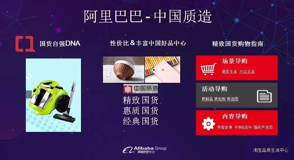 淘宝品质生活中心的中国质造板块是阿里巴巴战略性项目之一。中国作为全球最大消费商品供应中心,阿里巴巴去年推出了中国供给侧上线方案,让国内优质国际代工大厂出口及内贸双线发力,在中国质造上销售自有品牌,帮助优质企业提升获益能力,跟上时代做+互联网的工作。我们提供了一揽子扶持及解决方案 。去年有100多个产业带,数千家伙伴入驻。