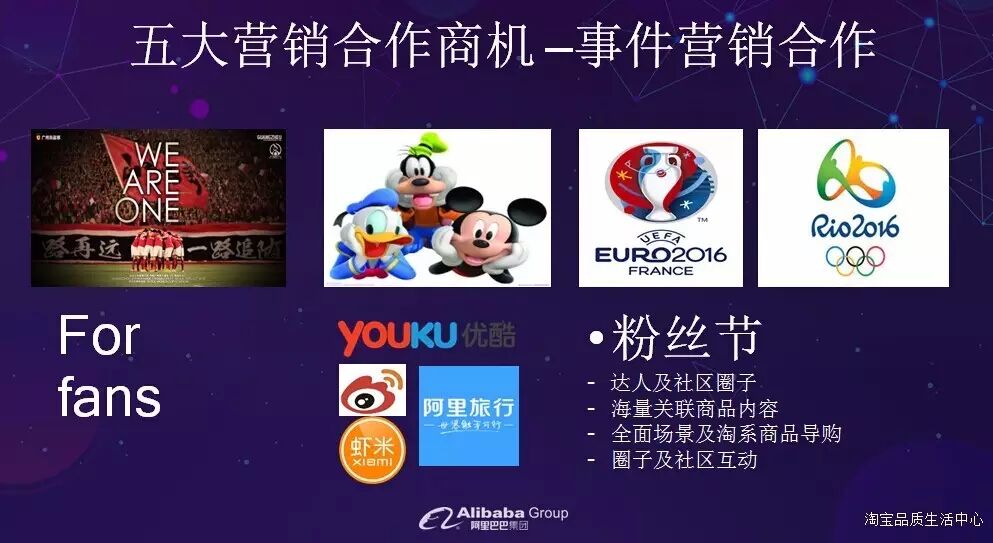 第四是事件营销合作商机。今年的中超、迪士尼、欧洲杯、奥运会,各大赛事我们都会有相关连接的方案。我们关心粉丝,我们工作的重点是粉丝的FUN,和粉丝共创有趣的参与,所有人都是为了快乐,所有粉丝参与进来,通过达人和社区圈子,通过海量商品的关联,以及全场景和商品式导购社区互动,驱动基于粉丝的事件营销合作。这个过程大家要积极加入进来,消费者关心的就是我们共同关注的,要有共同目标,才能获得更大的市场机遇。