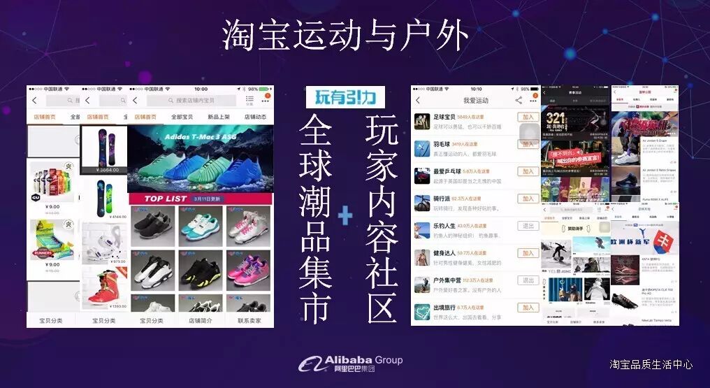 关于淘宝运动户外,我这里就强化两点。一是全球潮品集市,二是玩家内容社区。说到潮品集市,我们是从Sneaker中心到全球潮品装备最齐全的集市,最近很火的阿迪达斯NMD,大家进去看下就知道为什么我们会成为中心。提到玩家,我们需要告诉大家,在淘宝运动户外,一店一玩家,玩家即专家,每个卖家都是专家,他们都有自己的圈子,他们喜爱自己所经营的商品和参与的运动。他们就是一个个圈子的KOL,因为喜爱,所以专业。我们会构建这样的玩家型导购内容社区,让所有的达人型伙伴加入进来,一起带动运动和户外生活方式的推广,并在这个过程中分享您的收益。