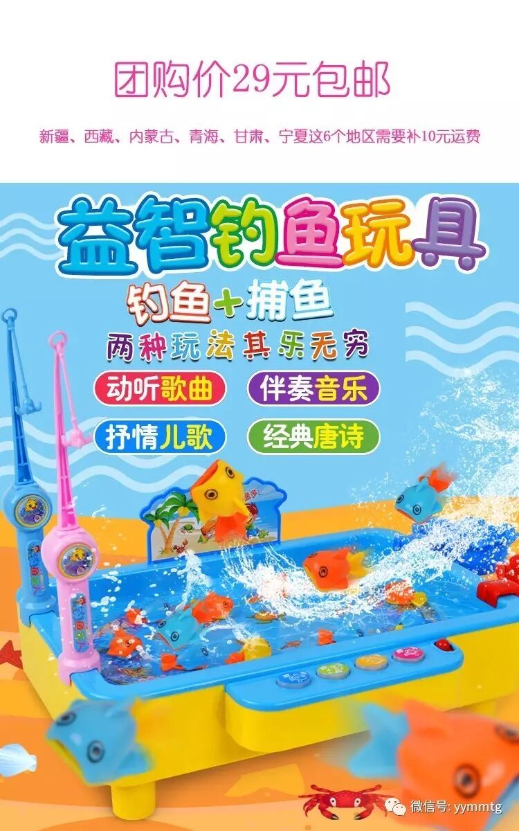 9月17日早9点半,儿童钓鱼玩具池套装来啦,电动磁性钓鱼玩具,鱼儿可游动, 钓鱼+捕鱼两种玩法,其乐无穷,动听歌曲,伴奏音乐,抒情儿歌,经典唐诗,益智早教,粑粑麻麻和孩子一起晚,享受亲子时光,还可以锻炼宝宝的手眼协调能力哦。团价29元包邮除偏远。