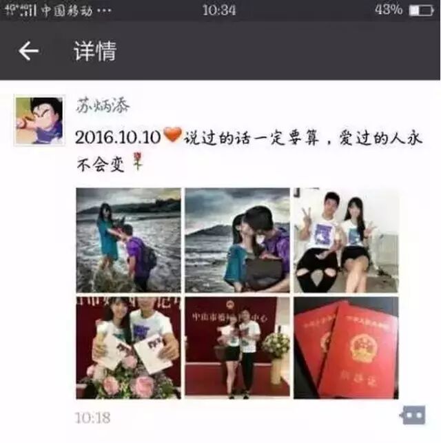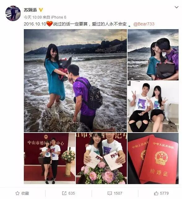 10月10日上午10时09分,“亚洲飞人”、中山添仔——苏炳添,在自己的微博发布消息:他与女友登记结婚了。他发布了和妻子6张甜蜜图片,并配以“说过的话一定要算,爱过的人永不会变”的话语,许下承诺。