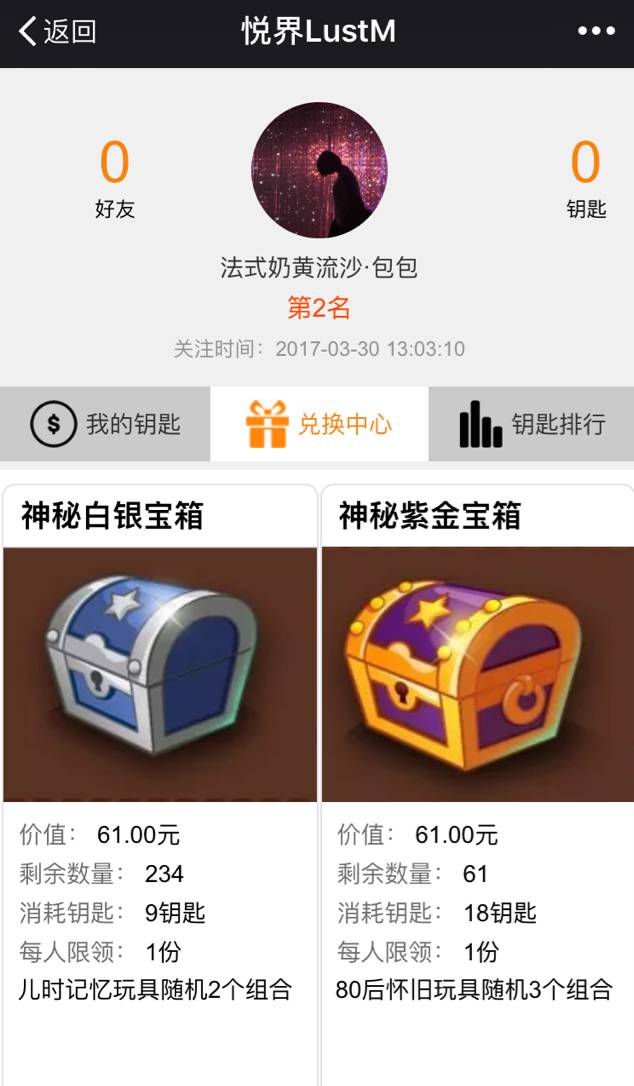 8.18把钥匙可兑换神秘紫金宝箱(随机3个玩具)1个,共61份