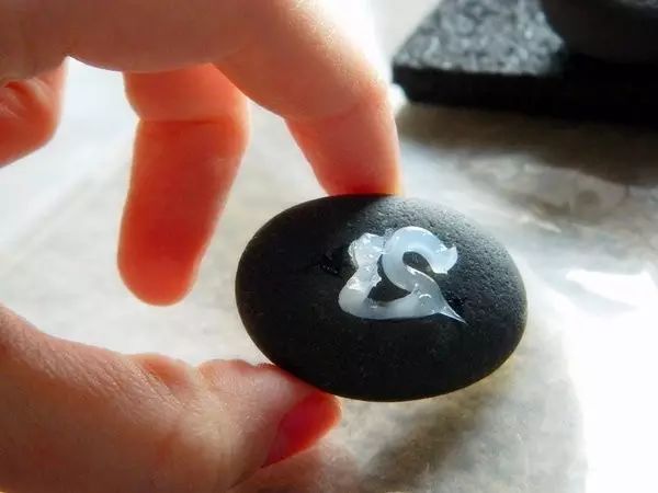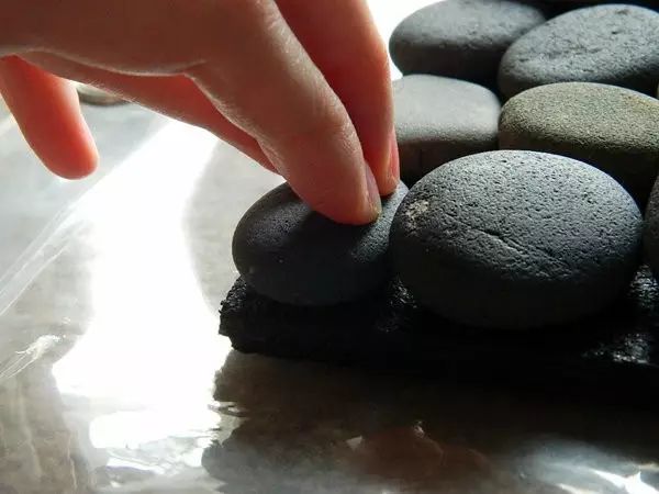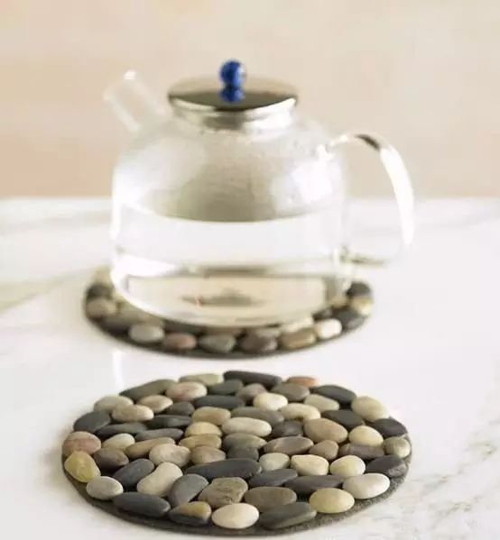 把涂有胶水的石头粘在垫子,按照一定的组合排列,打造艺术感。