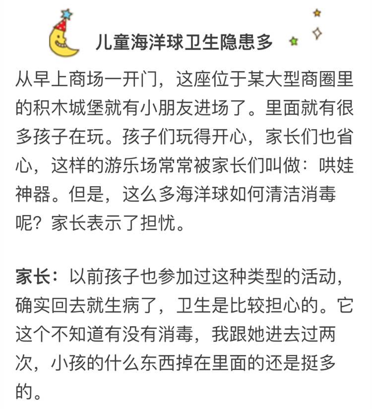 如今大型商圈里设置的儿童乐园越来越多,海洋球更是商家吸引小朋友的手段,,。目前又正值手足口病高发期,儿科医生介绍,没有严格消毒措施的儿童游乐场所存在不小的感染风险。