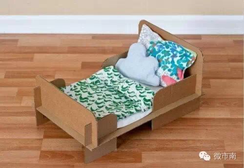 纸板小床 为小玩偶做个舒服的小床吧~找些硬纸板,搭建起来,小床就做完了,让孩子也参与进来! |