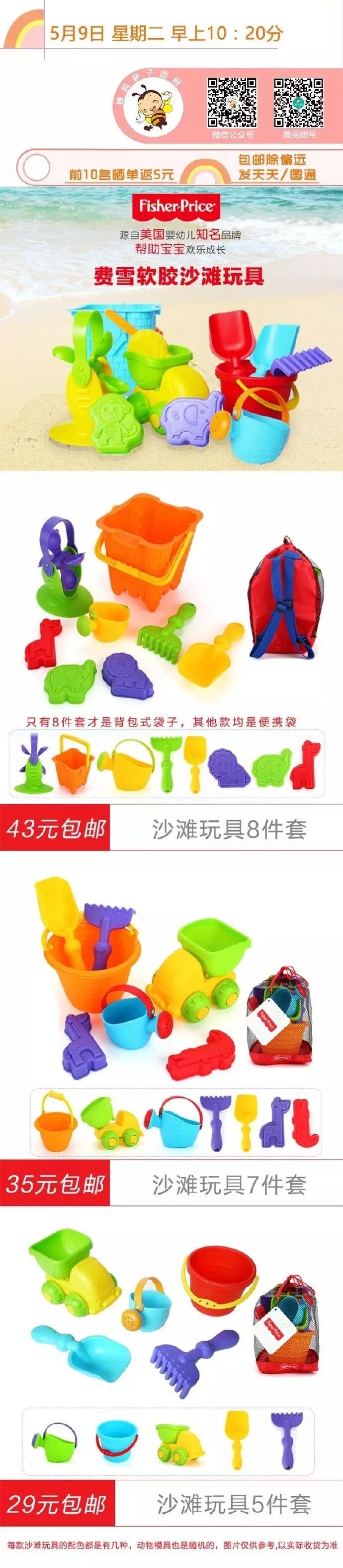 Fisher·Price费雪正品儿童沙滩玩具,天气越来越热,去海边玩耍正是时候,孩子们去海边必备的沙滩玩具都准备好了吗,费雪是源自美国的知名品牌,这一套玩具考虑到孩子们的安全,都是采用环保的PP软胶作为原材料,不含BPA,在玩儿的过程中无论是按、压还是小脚踩,都不会伤到宝宝,有5件套、7件套和8件套,价格详情戳图看,都配有沙滩包,收纳起来很方便。
