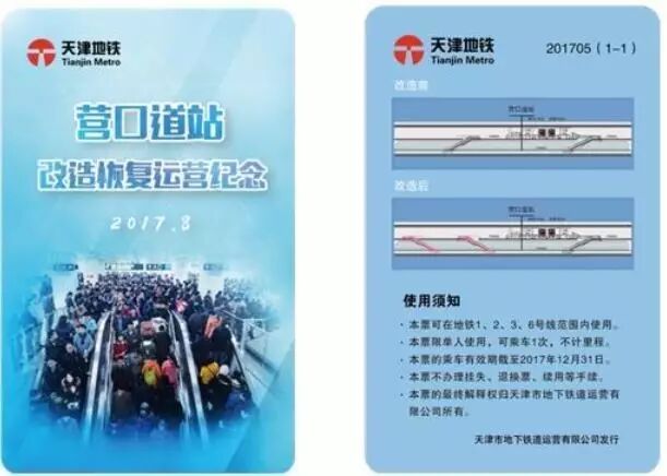 地铁运营公司将于8月16日同步限量发行2000套“营口道站改造恢复运营”主题纪念票。纪念票含地铁乘次票一枚,持该票可在地铁1、2、3、6号线范围内乘车1次,不计里程,有效期截至2017年12月31日。该纪念票售价为20元/套,可在营口道、天津站、西南角、长虹公园、红旗南路、西站、北站的客服中心购买,每人限购5套。