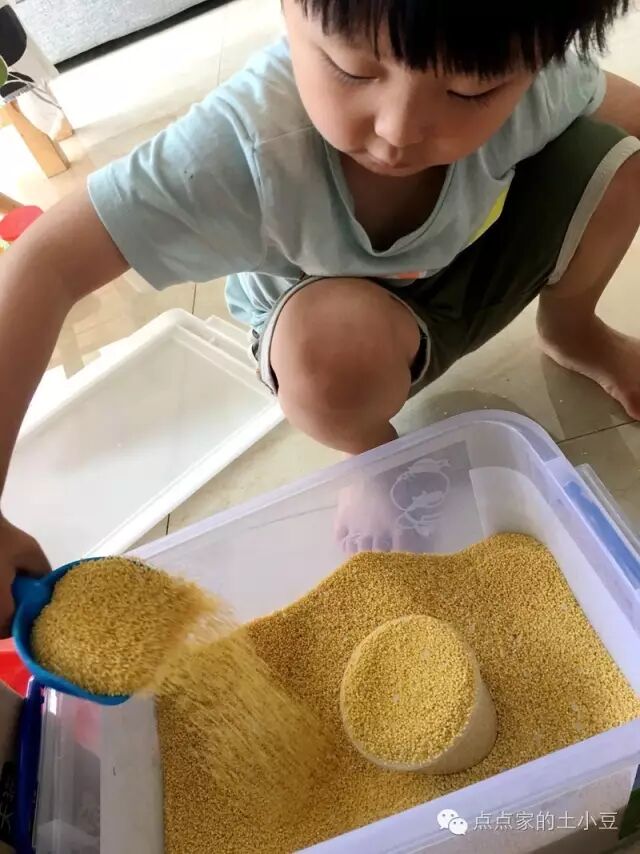 在国内的时候,玩沙子不像德国这么方便了,天气也特别热,于是土豆把米当成沙子玩,用我奶奶的话说就是,只有傻子才玩米啊,看来我们家有个傻儿子。