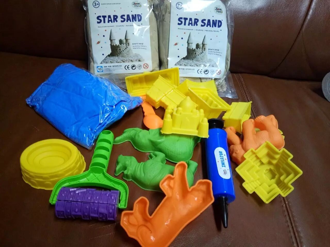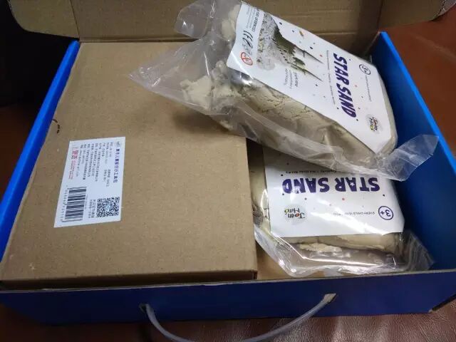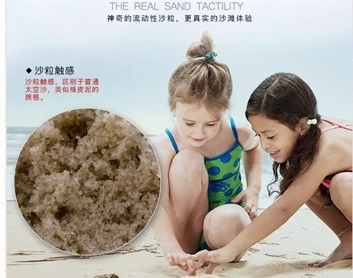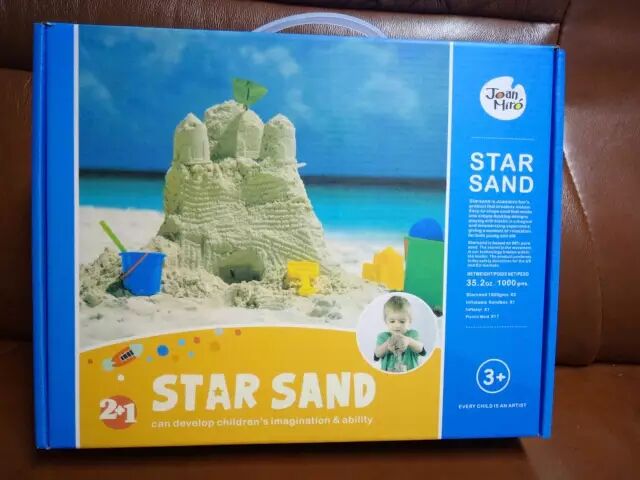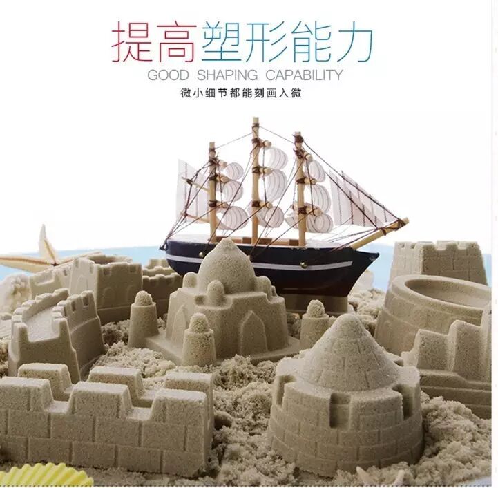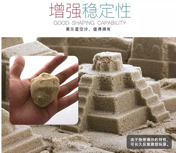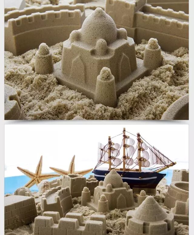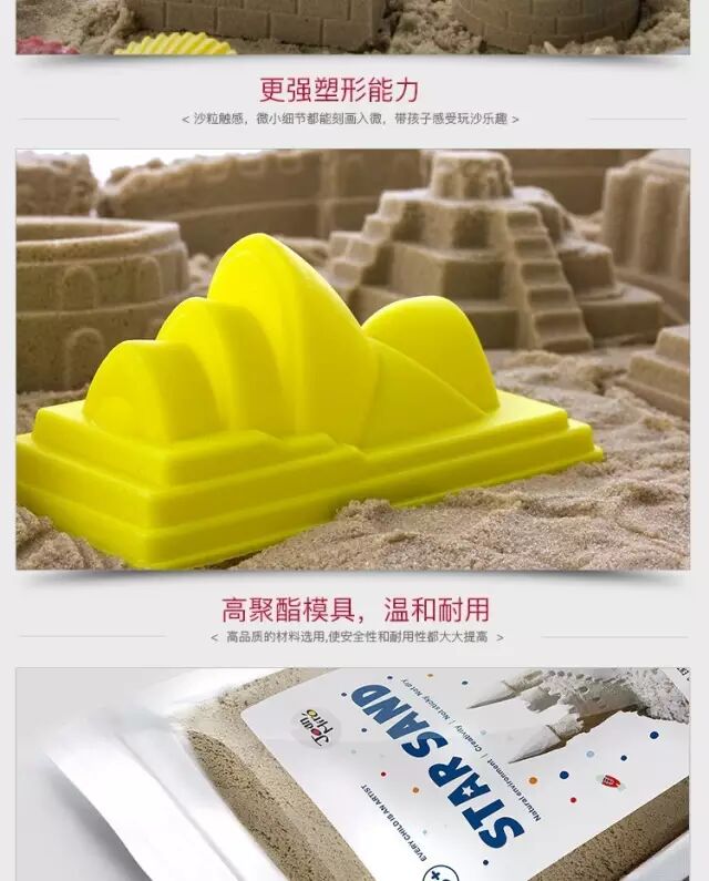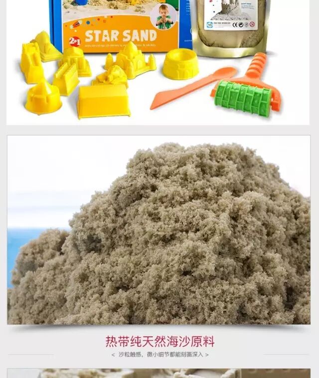1,沙子周五收到,昨天今天玩了两天来说一下感受。整体感觉很好,沙子非常细腻,湿软程度很好,最大特点就是沙子很好清理,不会像一般沙子一样一颗颗弄不干净,它用纸巾就能收拾好,不怕家里玩弄得到处都是。磨具也很丰富。沙子粘性适度,用纸巾就能把他们重新归在一起黏起来,不会出现沙粒到处都是的情况,这是这个沙子玩具最大的优点。