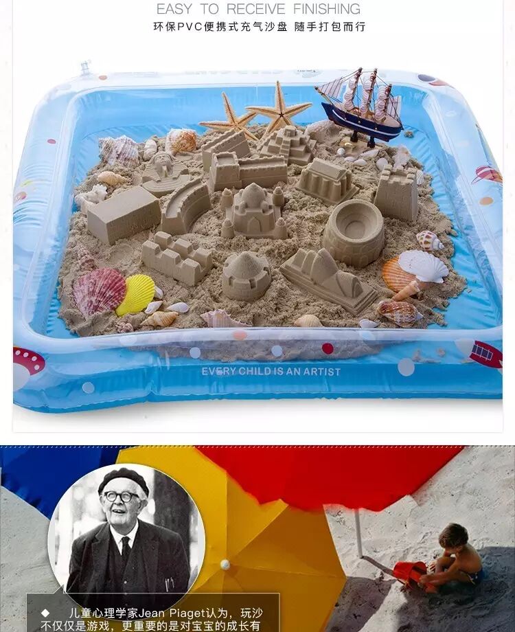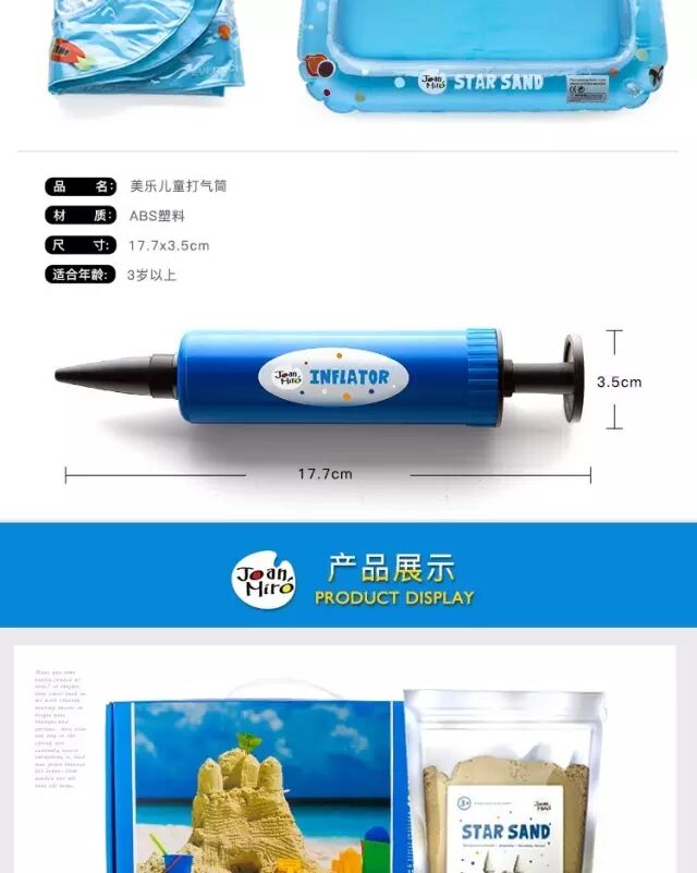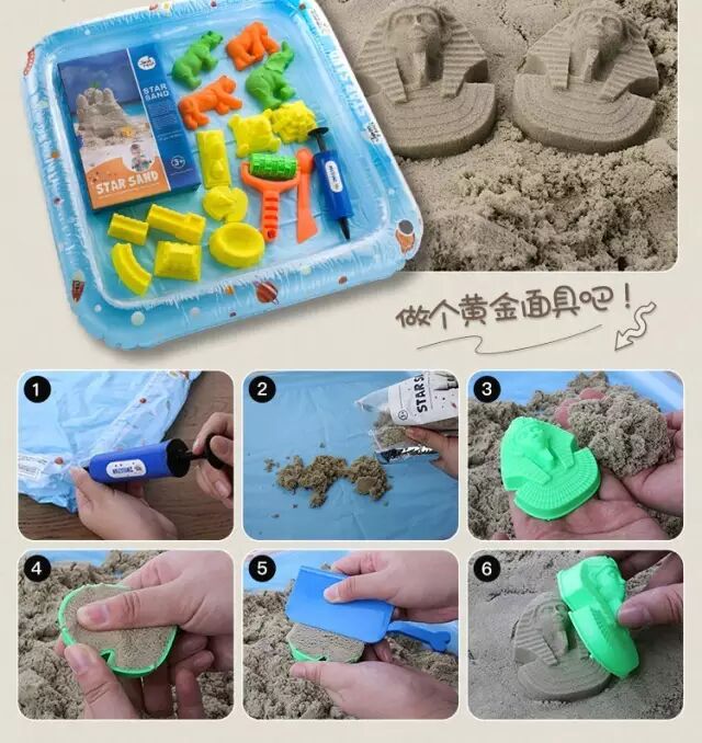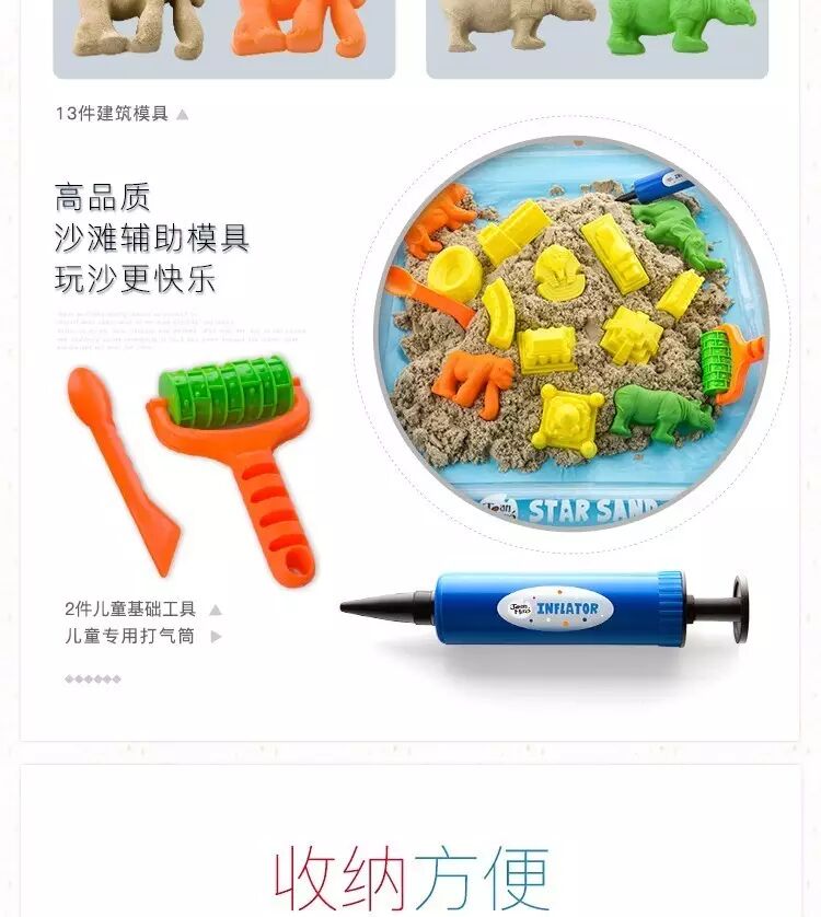 星空沙还配有充气沙盘和打气筒。充气后把沙子倒入沙盘,就成为一个小型沙滩了。有了它不仅方便收纳,还可以在宝宝玩耍时保持室内整洁。宝宝有了自己的小天地,不会缠着妈妈陪ta玩,妈妈也是省心省力。