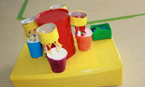 这是一款迷你型灌篮游戏,用一次性纸杯作为篮筐,用废旧矿泉水瓶盖作为篮球,小朋友试试用筷子夹着杯盖投入筐内,看着简单,其实很锻炼手的抓握能力呢。