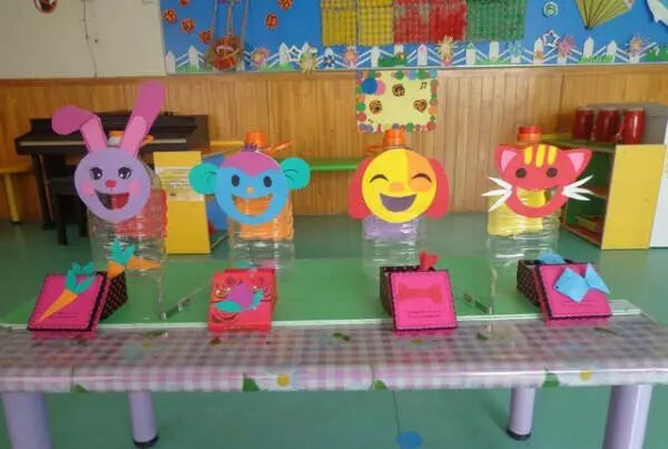 使用硬纸板、酸奶盒和即时贴制作成小房子的形状,并用即时贴分出小动物的房间和楼层;准备独立的小动物图片可以插入小房间中。让小朋友在操作材料中分辨左右方位,及在变形的形状中找出小动物对应的房间。