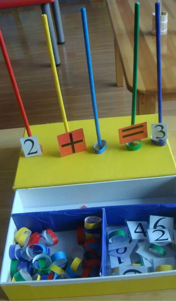 利用木棒和月饼盒制作成的数学教具,将数字粘贴在环装卡纸上,套在木棒上,形成算式,并进行计算。