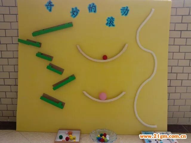 在日常生活中,孩子喜欢各种球类游戏。【奇妙的滚动】中设计了不同的运动轨道,如斜面、阶梯状、弧形、隧道。让孩子可以感受球体的运动方式,满足孩子的探索欲望。