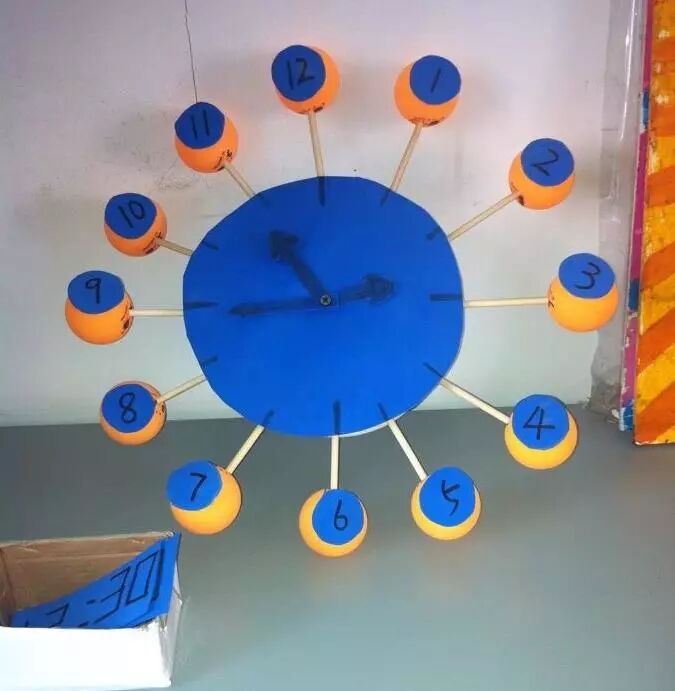 时间每时每刻都在往前走,小朋友感受到了吗?用一次性筷子和乒乓球改装成的“认识时钟”教具,可以教小朋友认识钟盘和时间哦~