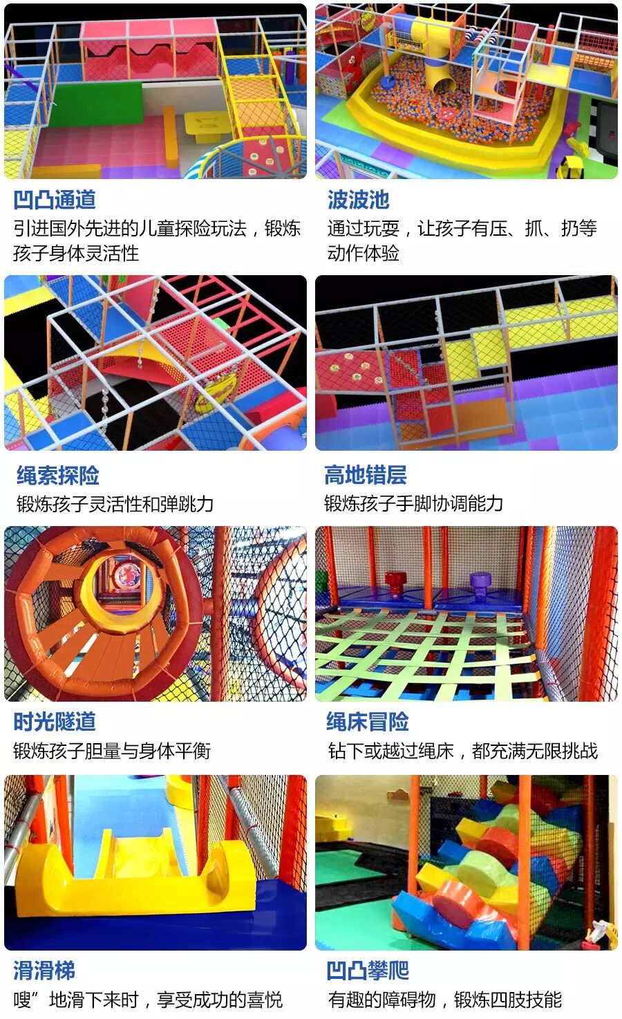 乐园二层是集游乐、运动、体能一体的探险乐园,引进国内外先进的儿童探险玩法,综合性极强,好玩而刺激。所有产品均由智贝工厂严格按工艺标准生产,采用安全、无害的材料,以市场导向、科技为先,不断突破、创新研发新产品,高品质的探险项目让孩子玩得舒心,家长放心。