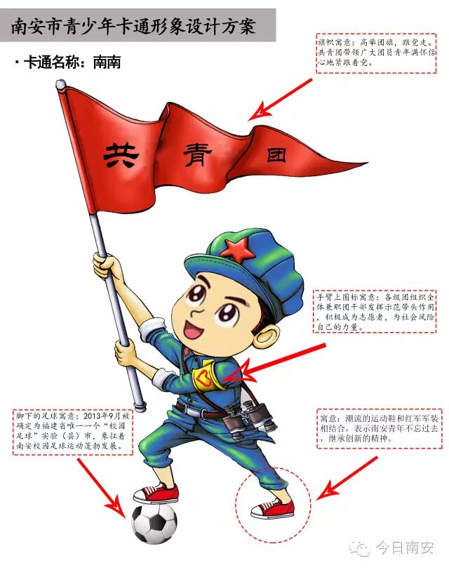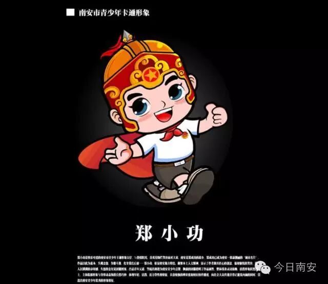 “南安是郑成功的故乡,郑成功已成为南安一张最靓丽的‘城市名片’。南安青少年卡通形象选择化身郑氏后裔的郑小功,彰显南安地方特色、凝聚本土人文精神。”团市委相关工作人员表示,温和愉悦的笑容,给人满满的亲切感,头盔的金星是团徽图案,凸显青年元素,竖起的拇指为南安青少年点赞,胸前的团徽指明了作品属性。整体线条灵动流畅,活泼形象跃然纸上,主体脸部形象与身形动态衔接自然巧妙,体现年轻、活泼、活力等性格特征,具备较强的辨识度和较好的传播度,向社会大众传递青春正能量内涵的同时,营造出南安青少年优秀的形象特征。