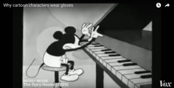 到了1929年,华特·迪斯尼非常机智地用白手套解决了这个问题。在1929年的动画电影《大剧院》中,米奇带着白手套弹钢琴的表演虽然略显浮夸,但的确使米奇看起来更像是人,而不是老鼠。